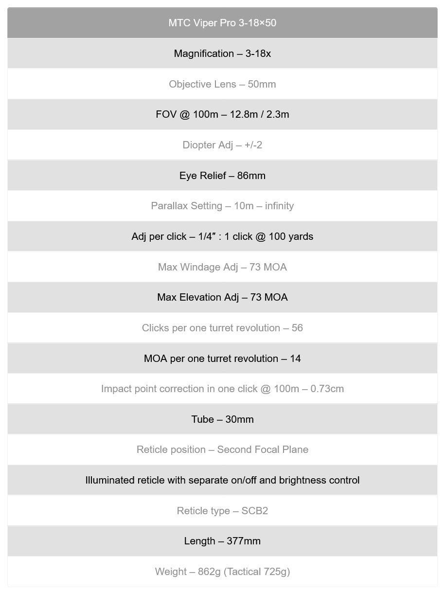 S/H MTC Viper Pro 3-18x50 IR SCB 2 Rifle Scope